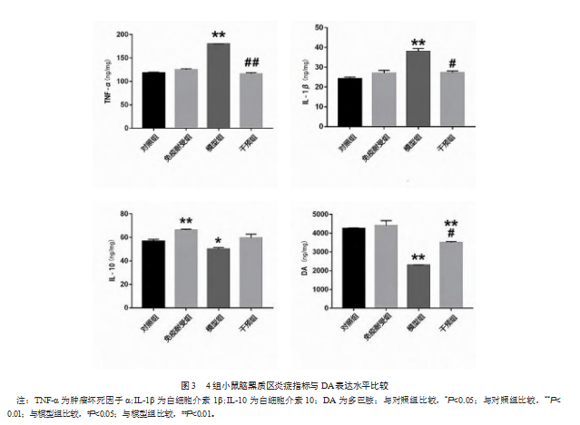 LPS阿拉丁试剂有限公司、小鼠肿瘤坏死因子α(tumor necrosis factor-α,TNF-α)酶联免疫吸附测定(enzyme-linked immunosorbent assay,ELISA)检测试剂盒(武汉博士德生物工程有限公司)、小鼠白细胞介素1β(interleukin 1β,IL-1β)检测试剂盒(武汉博士德生物工程有限公司)、小鼠白细胞介素10(interleukin 10,IL-10)检测试剂盒(武汉博士德生物工程有限公司)、小鼠的DA检测试剂盒(武汉博士德生物工程有限公司)、二辛可宁酸(bicincho⁃ninic acid,BCA)检测试剂盒(碧云天试剂有限公司)、酪氨酸羟化酶(tyrosine hydroxylase,TH)抗体(CST试剂有限公司)、Alexa Fluor 594驴抗兔免疫球蛋白G(immunoglobulin G,IgG)(CST试剂有限公司)。主要仪器:冰箱、4℃低温离心机、荧光显微镜、电子显微镜。