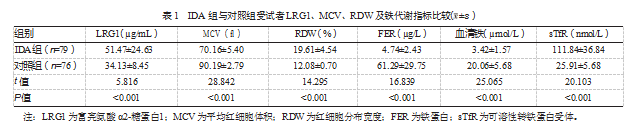 与对照组相比,IDA组患者MCV、FER和血清铁水平更低,RDW、sTfR和LRG1水平更高,差异均有统计学意义(P均<0.05)。见表1。