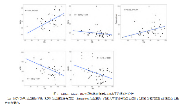 MCV、血清铁变化程度与Hb水平成正相关(r=0.585,0.398;P均<0.001)。LRG1、sTfR与Hb水平成负相关(r=-0.416,-0.510;P均<0.001),而RDW与Hb水平不相关(r=-0.212,P>0.05)。见图1。