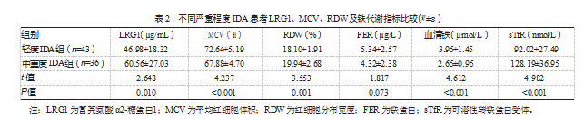 中重度IDA组MCV、血清铁水平低于轻度IDA组,RDW、sTfR、LRG1水平高于轻度IDA组,差异均有统计学意义(P均<0.05);两组FER水平比较,差异无统计学意义(P>0.05)。见表2。