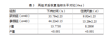 研究组下床时间、住院天数均较参照组有所缩短,差异均有统计学意义(P均<0.05)。见表3。