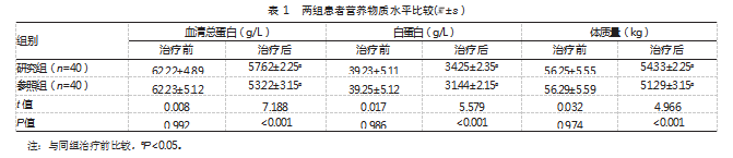 ①两组营养物质水平比较。分别在治疗前以及治疗后对两组食管癌患者的血清总蛋白、白蛋白、体质量水平展开比较。