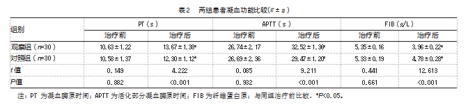 治疗后,两组PT、APTT长于治疗前,FIB低于治疗前,且观察组变化幅度大于对照组,差异均有统计学意义(P均<0.05)。见表2。
