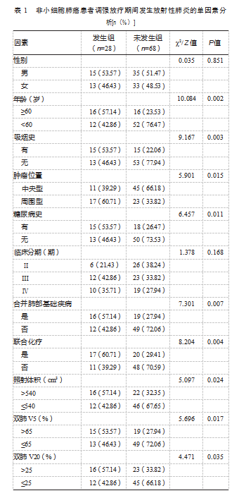 2.1非小细胞肺癌患者调强放疗期间发生放射性肺炎的单因素分析