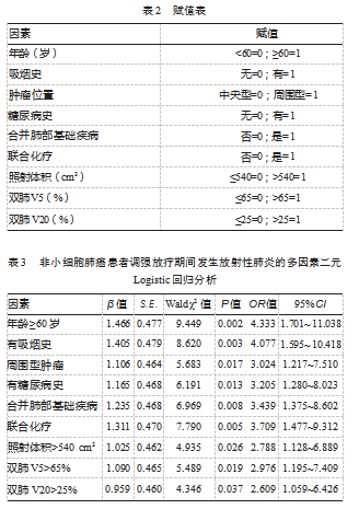 2.2非小细胞肺癌患者调强放疗期间发生放射性肺炎的多因素二元Logistic回归分析