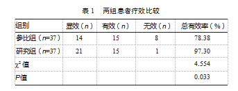 研究组总有效率高于参比组,差异有统计学意义(P<0.05)。见表1。