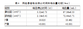 研究组咯血停止时间短于参比组,咯血量少于参比组,差异均有统计学意义(P均<0.05)。见表4。