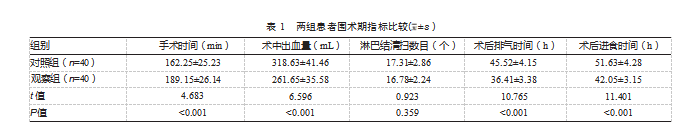 对比两组围术期指标,包括手术时间、术中出血量、淋巴结清扫数目、术后排气时间、术后进食时间。