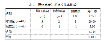 对比两组术后并发症发生情况。并发症包括切口、肺部感染以及肠梗阻。并发症发生率=并发症发生例数/总例数×100%。