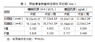 对比两组肿瘤标志物指标水平。于术前、术后1周采集患者5 mL空腹外周静脉血,离心获取血清(离心半径8 cm,转速2 000 r/min,离心15 min),使用酶联免疫吸附法测定糖类抗原19-9和癌胚抗原水平。