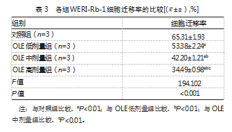 划痕实验数据显示,各组WERI-Rb-1细胞迁移率呈现剂量依赖性下降趋势,且4组比较差异有统计学意义(P<0.05)。见表3。