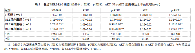 蛋白质免疫印迹实验数据显示,与对照组比较,各组WERI-Rb-1细胞MMP-9、p-PI3K、p-AKT蛋白表达水平呈现剂量依赖性下降趋势,且4组比较差异均有统计学意义(P均<0.05),但PI3K、AKT蛋白表达水平比较,差异均无统计学意义(P均>0.05)。见表5。
