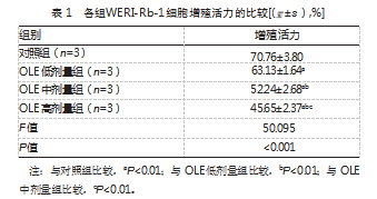 视网膜母细胞瘤预后极差,其恶性程度高并且较早发生转移。目前,视网膜母细胞瘤治疗尚无特异性手段,并且化疗效果有限,无法改善远处复发和转移[1-2]。以手术为主,辅以放疗、化疗的视网膜母细胞瘤治疗方案,效果并不理想,致死率和致盲率极高。虽然,分子靶向治疗等新型疗法已经应用于视网膜母细胞瘤的治疗,但是预后依然较差,5年生存率很低。临床上急需新的视网膜母细胞瘤治疗方法和新型药物。不良反应小的中药单体目前已经成为研究热点。橄榄苦苷(oleuropein,OLE)是木犀科植物的主要活性成分之一,具有多种药理作用,在对OLE药理作用的研究中,其抑制肿瘤细胞活性的药理作用受到关注[3-4]。探讨OLE对视网膜母细胞瘤WERI-Rb-1细胞恶性生物学行为干预作用及其分子机制,为OLE应用于视网膜母细胞瘤治疗和新药开发提供新的思路。