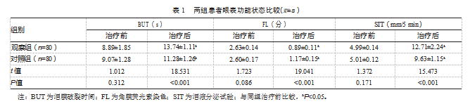 治疗后,观察组眼表功能状态优于对照组,差异均有统计学意义(P均<0.05)。见表1。