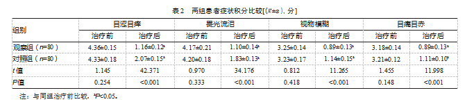 治疗后,观察组目涩目痒、畏光流泪、视物模糊及目痛目赤评分低于对照组,差异均有统计学意义(P均<0.05)。见表2。