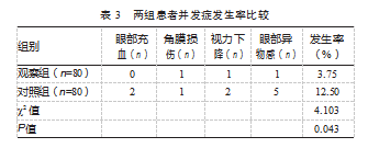 治疗后,观察组并发症发生率低于对照组,差异有统计学意义(P<0.05)。见表3。