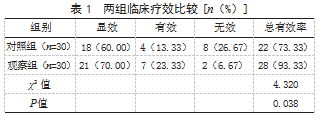 2.1两组临床疗效比较观察组治疗总有效率为93.33%(28/30),高于对照组的73.33%(22/30),差异有统计学意义(P<0.05)。见表1。