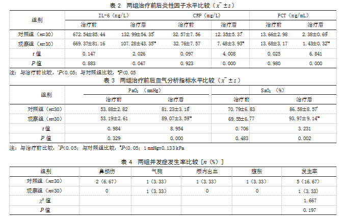 1.1一般资料回顾性分析2021年4月至2024年3月本院收治的60例新生儿肺炎合并呼吸衰竭患儿的临床资料。纳入标准:符合新生儿肺炎、呼吸衰竭诊断标准[4-5];经临床表现、胸部X线检查等确诊;符合机械通气指征;Ⅰ型呼吸衰竭;临床资料完整。排除标准:合并先天性心脏病或严重遗传性疾病;合并肝、肾等器官功能衰竭;先天面部畸形或面部皮肤损伤。患儿家长对本研究内容了解并自愿签署知情同意书。按照治疗方法不同将其分为对照组和观察组各30例。对照组:男16例,女14例;日龄1~28 d,平均(12.03±3.67)d;出生体质量1632~3785 g,平均(2634.12±622.48)g。观察组:男15例,女15例;日龄1~27 d,平均(13.24±4.23)d;出生体质量1535~3645 g,平均(2516.45±702.45)g。两组一般资料比较,差异无统计学意义(P>0.05),有可比性。