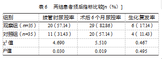观察组拔管时尿控率、术后6个月尿控率均高于对照组,差异均有统计学意义(P均<0.05);两组1年后生化复发率比较,差异无统计学意义(P>0.05)。见表6。