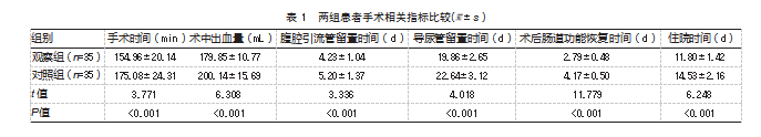 ①手术相关指标。记录手术时间、术中出血量、腹腔引流管留置时间、导尿管留置时间、术后肠道功能恢复时间、住院时间。