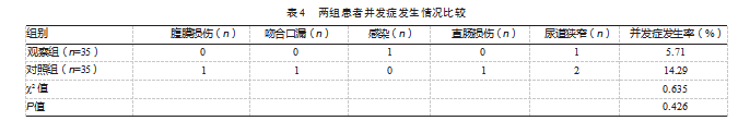 观察组腹膜损伤、吻合口漏、感染、直肠损伤、尿道狭窄发生率略低于对照组,但差异无统计学意义(P>0.05)。见表4。