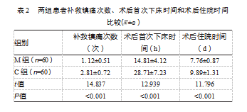 相比于C组,M组补救镇痛次数明显减少,术后首次下床时间和术后住院时间明显缩短,差异均有统计学意义(P均<0.05)。见表2。