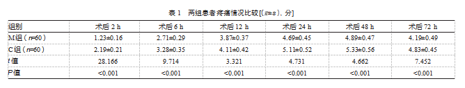 相比于C组,M组术后2、6、12、24、48、72 h的疼痛评分明显更低,差异均有统计学意义(t=28.166,9.714,3.321,4.731,4.662,7.452;P均<0.05)。见表1。