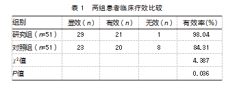 研究组治疗有效率高于对照组,差异有统计学意义(χ2=4.387,P<0.05)。见表1。