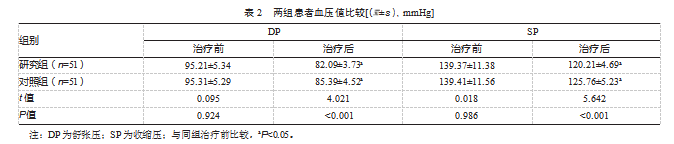 治疗前,两组DP、SP水平比较,差异均无统计学意义(P均>0.05);治疗后,两组血压值均降低,研究组血压值低于对照组(P均<0.05)。见表2。