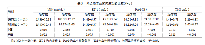 治疗前,两组血管内皮功能比较,差异均无统计学意义(P均>0.05);治疗后,两组血管内皮功能均有改善,研究组NO高于对照组,ET-1、PAG、TM均低于对照组差异均有统计学意义(P均<0.05)。见表3。
