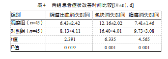 ③两组症状改善时间比较。症状包括阴道出血、包块、腹痛,记录这些症状改善的时间。