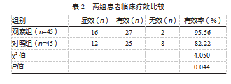 观察组治疗有效率高于对照组,差异有统计学意义(χ2=4.050,P<0.05)。见表2。