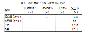 两组不良反应发生率比较,差异无统计学意义(P>0.05)。见表5。
