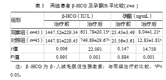 治疗后,观察组β-HCG及孕酮水平均低于对照组,差异均有统计学意义(P均<0.05)。见表3。