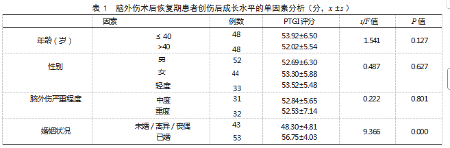 2.1脑外伤术后恢复期患者创伤后成长水平情况96例脑外伤患者的PTGI评分为(52.97±6.08)分。