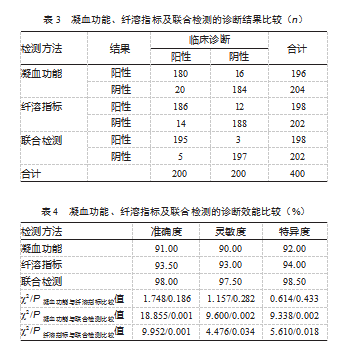 凝血功能与纤溶指标联合检测检出195例真阳性,197例真阴性。联合检测的准确度、灵敏度、特异度均高于凝血功能、纤溶指标单独检测,差异均有统计学意义(P均<0.05)。凝血功能、纤溶指标单独检测的准确度、灵敏度、特异度比较,差异均无统计学意义(P均>0.05)。见表3、表4。