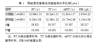 研究组PT、TT、APTT均短于对照组,FIB水平高于对照组,差异均有统计学意义(P均<0.05)。见表1。