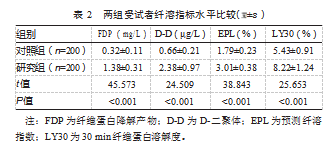 研究组FDP、D-D、EPL及LY30水平均高于对照组,差异均有统计学意义(P均<0.05)。见表2。