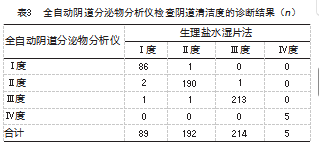 全自动阴道分泌物分析仪分析阴道清洁度Ⅰ度、Ⅱ度、Ⅲ度、Ⅳ度的符合率分别为96.63%(86/89)、98.96%(190/192)、99.53%(213/214)、100.00%(5/5)。见表3。