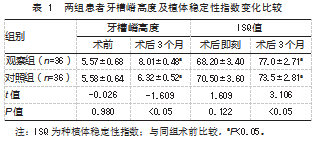 术后3个月,观察组牙槽嵴高度、ISQ值高于对照组,差异均有统计学意义(P均<0.05)。见表1。