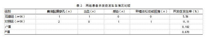 观察组和对照组的并发症发生率比较,差异无统计学意义(χ2=0.182,P>0.05)。见表2。