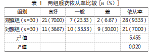 2.1两组服药依从率比较观察组服药依从率为93.33%(28/30),高于对照组的70.00%(21/30),差异有统计学意义(P<0.05)。见表1。