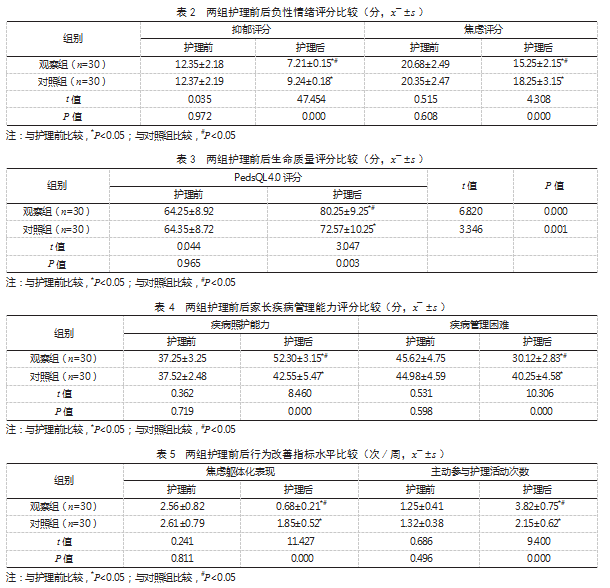 2.4两组护理前后家长疾病管理能力评分比较护理前,两组家长疾病照护能力、疾病管理困难等FaMM各维度评分比较,差异均无统计学意义(P>0.05);护理后,两组家长疾病照护能力维度FaMM评分均高于护理前,且观察组高于对照组,两组家长疾病管理困难维度FaMM评分均低于护理前,且观察组低于对照组,差异有统计学意义(P<0.05)。见表4。