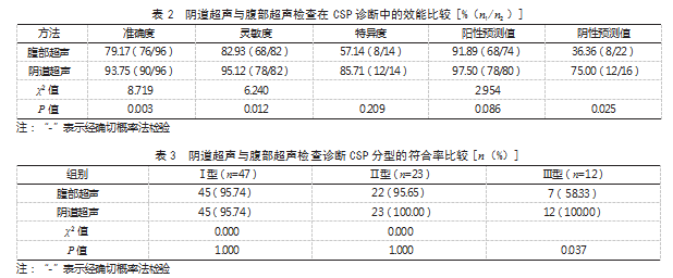 1.3观察指标(1)以磁共振成像检查和血人绒毛膜促性腺激素水平检测的综合判定结果为金标准,比较阴道超声与腹部超声检查诊断CSP的结果。(2)比较阴道超声与腹部超声检查在CSP诊断中的效能。(3)比较阴道超声与腹部超声检查诊断CSP分型的符合率。