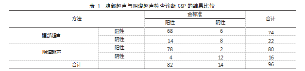 2.1阴道超声与腹部超声检查诊断CSP的结果比较96例疑似CSP患者中,金标准诊断阳性82例,阴性14例;腹部超声检查诊断阳性74例,阴性22例;阴道超声检查诊断阳性80例,阴性16例。见表1。