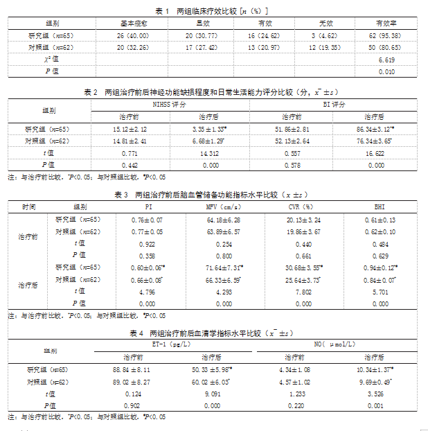 1.1一般资料回顾性分析2022年3月至2024年4月本院收治的127例ACI患者的临床资料。纳入标准:符合ACI的相关诊断标准[4];经颅脑CT、磁共振检查确诊;首次发病;美国国立卫生研究院卒中量表(NIHSS)评分≥10分;发病至入院时间<4.5 h;无出血倾向;临床资料完整。排除标准:合并颅内动脉瘤、脑血管畸形等其他脑血管疾病;凝血功能障碍;存在颅外伤;近2个月有颅脑手术史;精神异常;伴有心、肝、肾等重要脏器功能不全;对本研究所用药物过敏。按照治疗方法不同将其分为对照组(n=62)与研究组(n=65)。对照组男32例,女30例;年龄60~71岁,平均(65.73±2.03)岁;体质量指数22.47~26.80 kg/m2,平均(24.60±1.06)kg/m2;发病至入院时间1~4 h,平均(2.65±0.43)h;NIHSS评分10~20分,平均(15.23±3.26)分;梗死部位:丘脑15例,内囊16例,脑干19例,颞顶叶12例。研究组男30例,女35例;年龄61~72岁,平均(66.13±2.11)岁;体质量指数22.40~26.60 kg/m2,平均(24.51±1.05)kg/m2;发病至入院时间1~4 h,平均(2.55±0.53)h;NIHSS评分11~21分,平均(15.49±3.58)分;梗死部位:丘脑16例,内囊16例,脑干20例,颞顶叶13例。两组一般资料比较,差异无统计学意义(P>0.05),有可比性。
