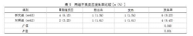 2.5两组不良反应发生率比较研究组不良反应发生率为9.23%,对照组不良反应发生率为6.45%,两组不良反应发生率比较,差异无统计学意义(P>0.05)。见表5。
