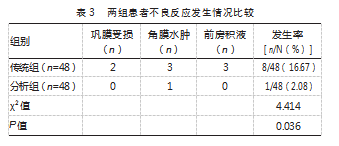 ②不良反应。观察治疗期间患者机体是否有巩膜受损、角膜水肿、前房积液不良反应发生,不良反应发生率=不良反应发生例数/总例数×100%。
