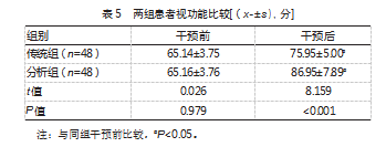 干预后,分析组视功能高于传统组,差异有统计学意义(P<0.05)。见表5。