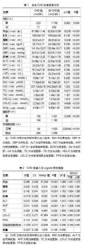 回顾性选取2019年10月—2023年10月在山东电力中心医院进行体检的2 875例受检者的临床资料,依据是否患有CHD分为CHD组(n=294)与非CHD组(n=2 581)。其中男1 971例,女904例,年龄23~91岁。本研究经山东电力中心医院伦理委员会审查批准(GGH-SDEPCH-HP-20230101-2022-02),建档时,研究对象知情同意且签署知情同意书。